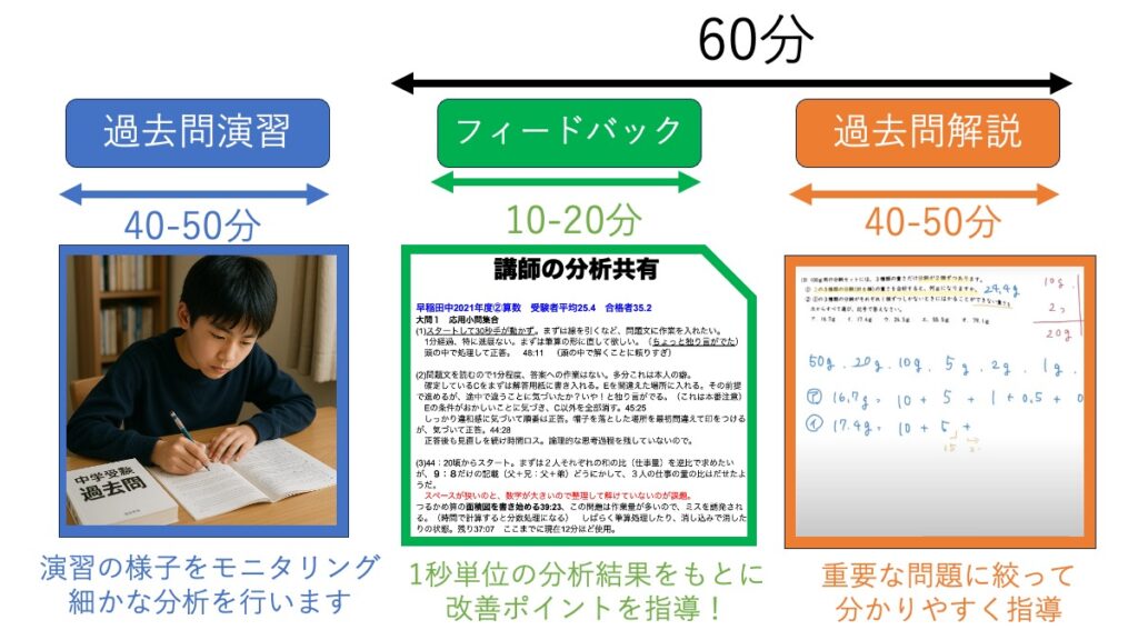過去問合格に向けて、何が足りないのか、何を意識して取り組むべきかなど、実践の直後にフィードバックを行います。